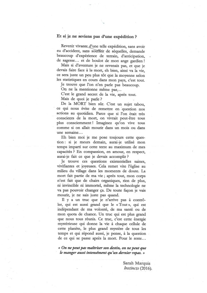 - Extrait de Sarah Marquis, « Instincts », Éditions Pocket, 2017. ↩︎