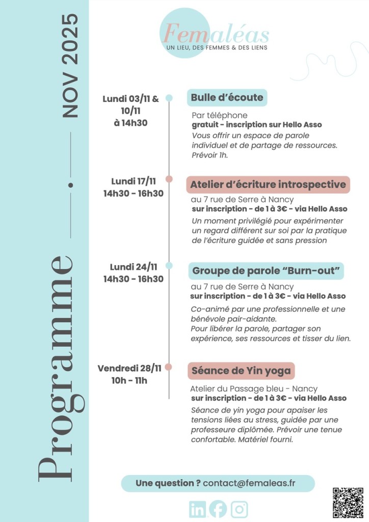 Au programme pour novembre de l’association Femaléas — espace ressource dédié aux femmes pour les aider à surmonter les aléas de la vie et les événements traumatiques : bulles d’écoute, ateliers d’écriture introspective, groupe de parole,… ; et pour ce qui m’implique directement, je consacre un deuxième atelier yoga à l’apaisement de tensions liées au stress.