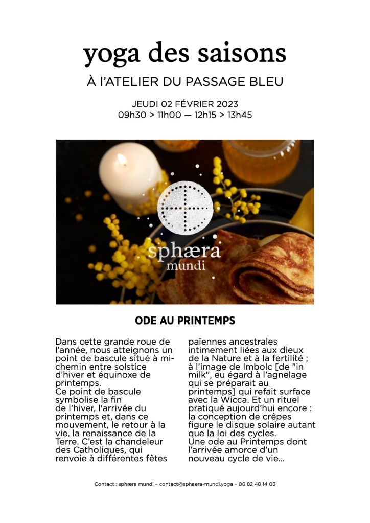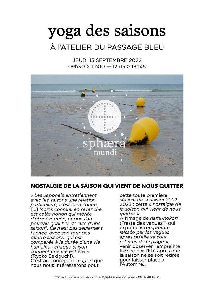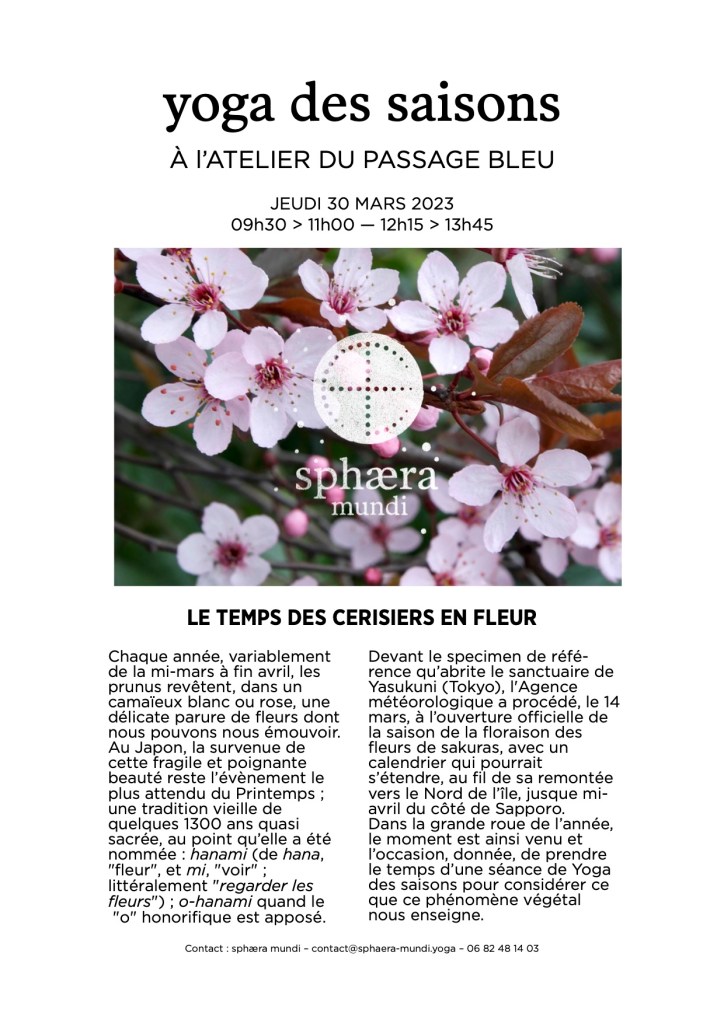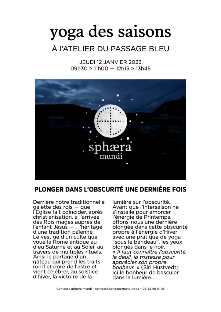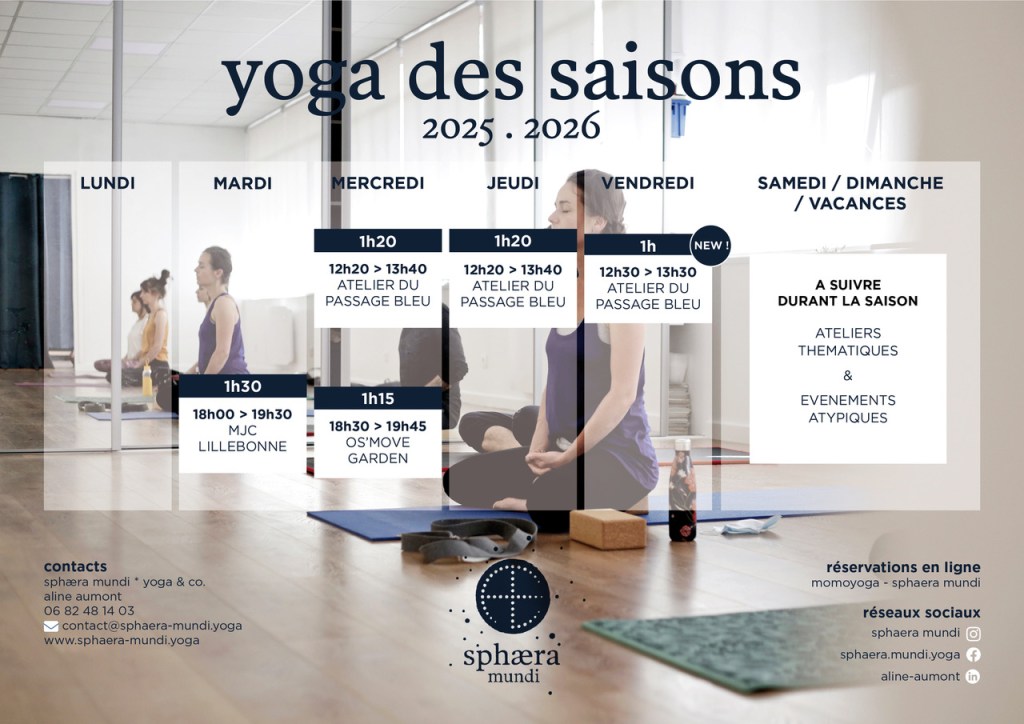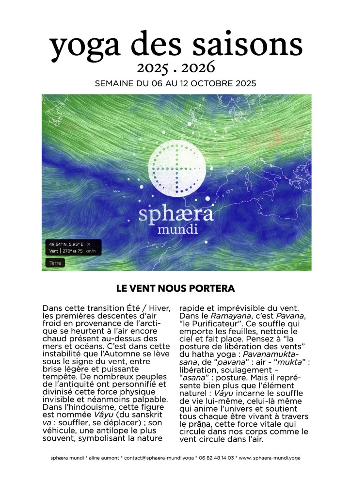 Au-delà d’invoquer la pratique du yoga pour les nombreux bienfaits qui lui sont inhérents (détente, souplesse, concentration, capacité respiratoire…), cette approche s’attache à puiser dans différents enseignements, répertoires et outils (hatha yoga, yin yoga, yoga des yeux, kundalini yoga, mudras, mantras, énergétique chinoise,…) pour se mettre à l’écoute de la nature et se syn- chroniser, au fil des semaines, à l’énergie propre à chaque saison.